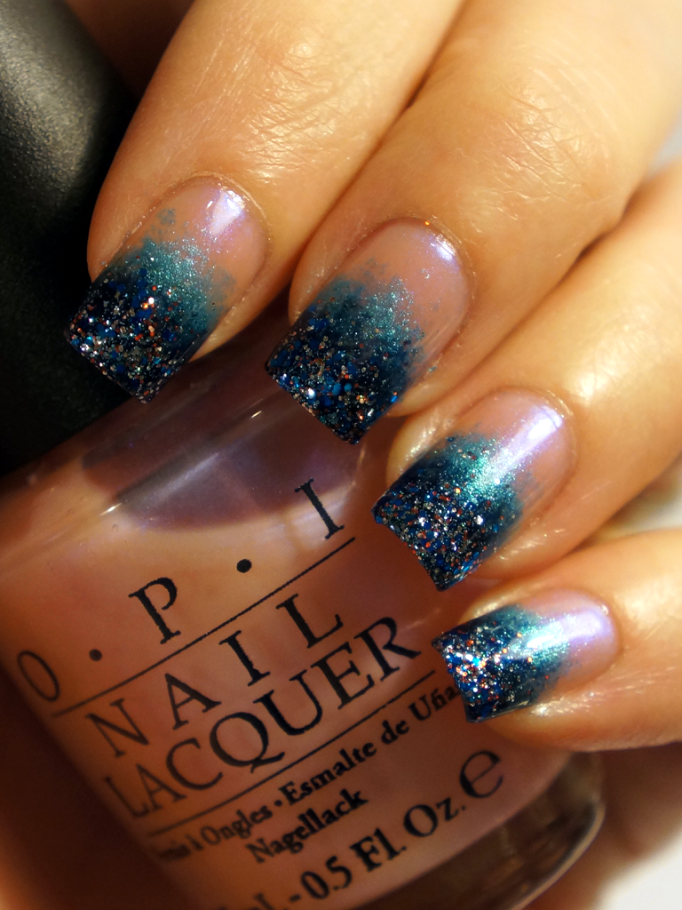 Jag har först grundat med OPI Rosy Future och sedan svampat ca halva nageln med IsaDora Turquoise och försökt få en så mjuk övergång som möjligt från blå till naturell/pärlemoprosa som möjligt. För att få det lite mörkare längre ut så använde ja mig av Gina Tricot Holographic Blue men den ville inte riktigt leka med mig så jag plockade fram IsaDora Polar Nights istället. Sist men inte minst toppade jag med Sparkling Blue från Mavala för att få lite extra glitter och glamour.